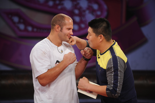 씨름 ‘천하장사’ 출신 강호동이 ‘격투기의 황제’ 표도르와 SBS ‘스타킹’ 녹화장에서 빅매치를 펼쳤다. 결과는 표도르의 한판 승. 29일 서울 장충체육관에서 열린 종합격투기 M-1 챌린지서울대회 홍보를 위해 방한한 표도르는 30일 새벽 '스타킹' 녹화에 참석, 강호동과 씨름 격투기 대결을 펼쳤다. 이날 표도르는 대결 뿐만 아니라 출연진에게 화려한 이종격투기 기술을 전수하기도 했다. 지난해 MBC '무한도전'에 출연했던 표도르는 29일 '웃찾사'에도 출연했으며, '스타킹'의 이날 녹화분은 내달 6일 저녁 6시 35분 방송된다. yu@osen.co.kr SBS 제공.