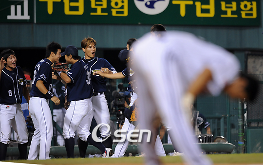 '2008 삼성 PAVV 프로야구' LG 트윈스와 두산 베어스의 경기가 30일 서울 잠실구장에서 벌어졌다. 7회말 2사 주자 1,2루 LG 김상현의 중전안타로 2루 주자 박용택이 홈으로 쇄도하였으나 실수로 홈을 밟지 않아 태그아웃된 후 자책하고 있다. 그리고 그 뒤에서 결정적인 실점위기를 넘긴 두산 선수들이 기뻐하고 있다./잠실=민경훈 기자 rumi@osen.co.kr