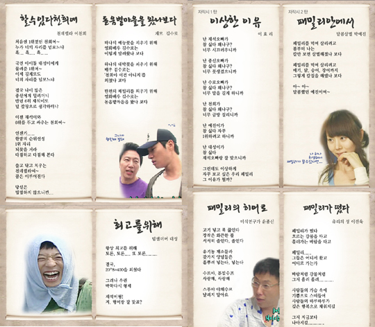SBS 예능 프로그램 ‘일요일이 좋다-패밀리가 떴다(이하 패떳)’에서 방송된 멤버들의 자작시가 시청자들의 눈길을 끌고 있다. 지난 31일 방송된 ‘패떴’에서는 서정주 시인의 고향인 전북 고창 돋음별 마을을 찾아 멤버들이 자작시를 낭송하는 시간을 가졌다. 이날 이효리는 ‘이상한 이유’라는 제목의 시를 통해 ‘난 재석 오빠가 참 싫다. 왜냐구 너무 시끄러우니까 / 난 종신 오빠가 참 싫다. 왜냐구 너무 못생겼으니까 / 난 수로 오빠가 참 싫다. 왜냐구 너무 말을 길게 하니까 / 난 천희가 참 싫다. 왜냐구 너무 금방 질리니까 / 난 예진이가 참 싫다. 자꾸 1위하려고 하니까 / 난 대성이가 참 싫다. 재석오빠랑 잘 맞으니까’ 라고 운을 띄운 뒤, 마지막에 ‘그런데도 이상하게 자꾸 보고 싶은 우리 패밀리 그 이유가 뭘까’라는 반전으로 재치를 발휘, 멤버들에 대한 깊은 애정을 보였다. 이번 주 뉴패밀리였던 이진욱의 자작시도 이목을 끌었다. ‘흐르는 강물을 타고, 흘러가는 바람을 타고, 패밀리 그들은 어디서 왔고 어디로 가는가 / 바람처럼 강물처럼 그저 흘러 흘러 / 사람들의 가슴 속에 기쁨으로 흘러 흘러 / 사람들의 하루하루가 깊은 행복으로 채워지길 / 그저 지금만 같기를…’이라는 제법 진지한 시를 자작했다. 이날 이진욱의 시는 멤버들의 만장일치로 선택돼 마을 어귀에 적혀지는 행운을 얻었다. ‘천데렐라’ 이천희는 ‘처음엔 1위였던 천희야 누가 너의 자리를 넘보느냐’란 시를 읊어 웃음을 자아냈다. ‘김계모’ 김수로는 시를 통해 방송에 임하는 각오를 표현했고, 빅뱅 멤버 대성은 ‘최고를 위해’란 시를 통해 국민MC 유재석과 일명 '덤앤 더머' 캐릭터로 인기를 끌고 있는 소감을 밝혔다. 박예진은 서정주 시인의 ‘국화꽃 옆에서’를 빗대어 ‘패밀리들을 먹여 살리기 위해 나 자신은 그렇게 살벌해졌나보다’란 자작시를 낭송하기도 했다. 이 같은 인기에 힘입어 현재 ‘패떴’ 홈페이지(http://tv.sbs.co.kr/newsunday)에서는 이효리는 물론, 패밀리들의 자작시 평가 이벤트가 이뤄지고 있다. 현재 100여개의 댓글 중에는 ‘난 효리언니가 참 싫다. 왜냐구? 같은 여잔데도 빠져나올 수 없는 매력 덩어리니까 (ID:sj5445)’,‘이상하게 자꾸 보고 싶은 우리 패밀리가 떴다. 그 이유가 뭘까? (ID:lovesojung92)’등 자작시를 패러디한 내용도 눈에 띈다. 한편, ‘패떴’는 이날 시청률 20%(AGB닐슨 집계, 전국 기준)을 기록, 일요일 저녁 예능버라이어티의 최강자 자리를 굳혔다. yu@osen.co.kr SBS ‘패밀리가 떴다’ 홈페이지.