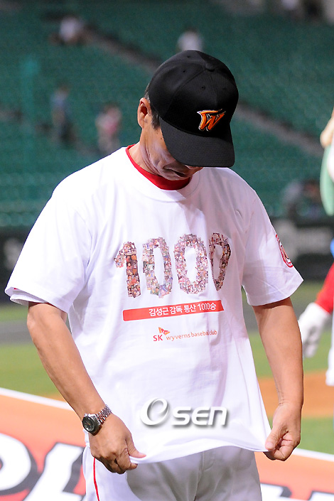'2008 삼성 PAVV 프로야구' SK 와이번스와 히어로즈 경기가 3일 문학구장에서 벌어졌다. SK 와이번스가 8-0으로 완승을 거두며 김성근 감독이 1,000승 달성을 기록했다. 김성근 감독이 경기종료후 기념행사에서 1,000승 달성까지 감독직을 맡았던 구단의 승리투수 얼굴이 새겨진 티셔츠를 바라보고 있다./인천=김영민 기자ajyoung@osen.co.kr