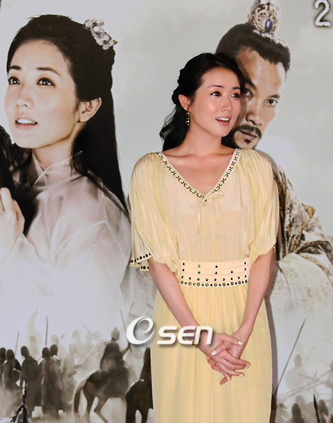 KBS 새 수목 드라마 '바람의 나라' 제작보고회가 4일 용산 CGV에서 강일수 감독, 주연배우 송일국, 정진영, 최정원, 박건형, 오윤아, 김상호, 박상욱, 김재욱, 김혜성, 장태성이 참석한 가운데 열렸다. '바람의 나라'는 고구려 3대왕 대무신왕의 전기를 그린 김진의 동명만화를 드라마화 한 작품이다. 드라마에서 송일국의 연인 '연'으로 나오는 최정원이 포토타임을 갖고 있다./손용호 기자spjj@osen.co.kr