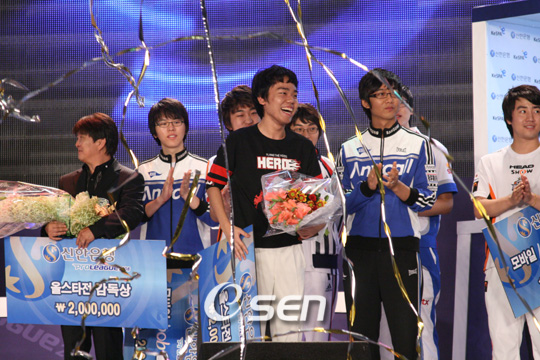 프로토스 라인이 주축이 된 도전팀이 2008시즌 올스타전서 환하게 웃었다. 이명근 감독이 지휘하는 도전팀은 6일 부산 벡스코 IT 엑스포 특설무대에서 열린 '프로리그 2008시즌 올스타전'서 허영무, 도재욱 김구현 등 프로토스 라인과 마무리를 지은 이영호의 활약에 힘입어 4-3 승리를 거뒀다. 팬 선정 6명과 감독 추천 선수 12명 등 18명의 별들 중 최고의 별 MVP는 2년 9개월만의 숙적 송병구를 제압한 '염선생' 염보성에게 돌아갔다. 처음으로 MVP에 선정된 염보성은 상금 200만을 받았다. 이번 올스타전은 MVP는 열정팀 염보성에게 돌아갔지만 도전팀 프로토스 라인의 저력이 돋보인 한 판 승부였다. 경기 전 최고의 프로토스 선수들과 같은 팀에서 뛰고 싶다고 속내를 밝힌 이명근 감독의 말처럼 도전팀 프로토스 라인은 2008시즌을 빛낸 최고의 선수들 다웠다. 도전 팀은 선봉 허영무를 시작으로 도재욱 김구현 등 특급 프로토스 선수들의 힘을 바탕으로 열정팀을 몰아붙였다. 허영무는 이윤열을 상대로 환상적인 셔틀-리버 견제를, 도재욱은 힘으로 박찬수를 제압했다. 프로토스의 마지막 카드로 출전한 김구현은 묵직한 지상군 압박에 이은 화려한 캐리어 협공으로 손주흥을 눌렀다. 열정팀은 테란 라인이 활약한 팀플레이와 오랜만에 송병구를 누른 염보성의 활약으로 추격에 나섰다. 프로토스가 주축이 된 도전팀과 팀플레이가 주력인 열정팀의 맞대결은 결국 마지막 7세트서 승부가 갈렸다. 도전 팀의 이영호는 KeSPA 랭킹 1위 답게 흠잡을데 없이 물흐르듯 부드러운 메카닉 전략의 진수를 보여주며 올스타전의 승부를 결정지었다. 한편 공군 입대 전 마지막 경기를 치른 '폭풍' 홍진호는 인기상을 받으며 변함없는 인기를 과시했다. ◆ 프로리그 2008 올스타전. ▲ 열정팀 3-4 도전팀. 1세트 이윤열(테란, 7시) 허영무(프로토스, 4시) 승. 2세트 박찬수(저그, 7시) 도재욱(프로토스, 1시) 승. 3세트 신희승(테, 12시)/손재범(프, 11시) 이성은(테, 7시)/윤용태(프, 1시). 4세트 염보성(테란, 1시) 승 송병구(프로토스, 7시). 5세트 손주흥(테란, 7시) 김구현(프로토스, 5시) 승. 6세트 박대만(프, 8시)/전상욱(테, 2시) 신상문(테, 12시)/홍진호(저, 6시). 7세트 이제동(저그, 12시) 이영호(테란, 6시) 승. scrapper@osen.co.kr