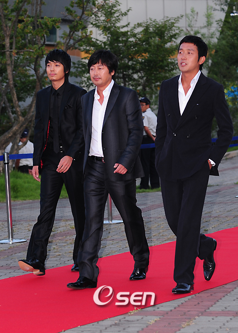 한국영화계의 선각자인 춘사 나운규 선생의 역사적 의미를 기리고 영화 발전에 기여한 영화인 및 우수한 작품을 선정, 시상하기 위해 마련된 ‘제16회 이천 춘사 대상영화제’(주최 이천시/한국영화감독협회, 집행위원장 정인엽) 시상식이 6일 저녁 경기도 이천시 설봉공원에서 열렸다. 임하룡, 오정해의 사회로 진행된 이날 시상식은 ‘나운규의 일생’을 연극으로 꾸민 독특한 형식으로 치러졌다. 하정우 김윤석 정경호 레드카펫을 밟으며 입장하고 있다./이천=윤민호 기자 ymh@osen.co.kr