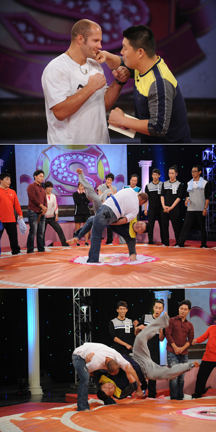 천하장사 출신 강호동이 세계적인 격투기 선수 효도르와 씨름 격투기 한판을 펼쳤다. 결과는? 무승부였다. 6일 방송된 SBS TV ‘스타킹’에서는 종합격투기 M-1 챌린지서울대회 홍보를 위해 방한한 표도르가 출연, 강호동과 씨름, 격투기 대결을 펼쳤다. 강호동은 “내가 효도르와 경기를 펼친다면 어떻게 될 것인가 항상 시뮬레이션을 그려왔다”며 운을 뗐다. 이날 강호동은 표도르에게 뒤집기와 오른다리 들어 배지기 등 씨름 기술을 전수했으며, 효도르 또한 출연진에게 화려한 이종격투기 기술을 전수했다. 강호동의 첫 인상에 대해 “외모가 참 재미있다”고 말한 효도르는 강호동과의 씨름 대결에서 “기술적인 면이 훌륭하고 이 부분에 대해 연습을 해보고 싶다”고 경기에 임한 소감을 전했다. 강호동은 효도르에 대해 “인간 차돌 같다. 빈틈이 하나도 없다”는 느낌을 전했다. 씨름에서는 강호동이, 격투기에서 효도르가 승리해 자웅을 가릴 수는 없었던 결과처럼 ‘천하장사’ 출신 강호동에게 세계 격투기 전적 28전 27승 1패인 효도르는 역시 막강한 상대였다. yu@osen.co.kr