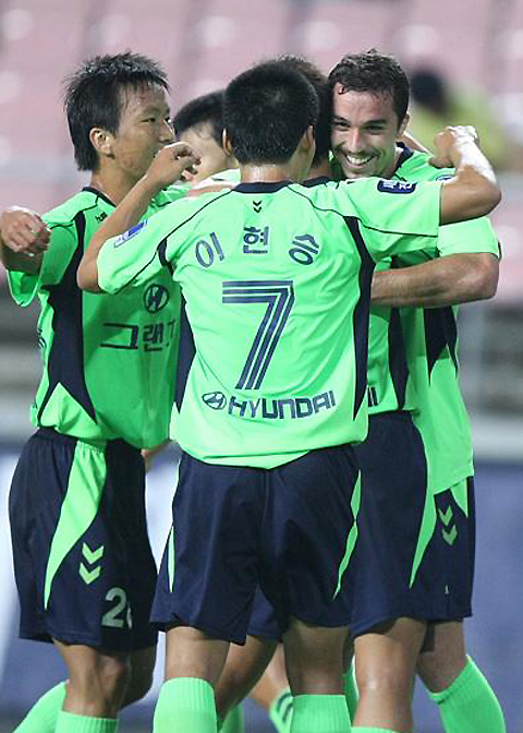 전북이 컵대회 8경기 무패행진을 이어갔다. 최강희 감독이 이끄는 전북 현대가 6일 전주 월드컵경기장에서 열린 삼성 하우젠 컵 2008 9라운드 대구FC와 경기서 1-1로 무승부를 거두었다. 이로써 전북은 6강 플레이오프 진출을 위한 발판을 마련하면서 컵대회서 8경기(4승4무) 무패를 기록했다. '막강 화력'을 자랑하는 대구는 경기 초반 에닝요를 중심으로 전북을 압박했다. 빠른 패스 연결을 통해 전북의 수비진을 흔들던 대구는 수 차례 득점 찬스를 맞았지만 결정력 부족으로 골을 뽑아내는 데 실패했다. 대구의 공세를 잘 막아낸 전북은 전반 15분 선취점을 뽑아냈다. 문전에 있던 다이치가 후방에서 올라온 크로스를 헤딩으로 떨궈 정경호에게 준 뒤 다시 받아 가볍게 차 넣으며 1-0으로 달아난 것. 실점 후 대구는 더욱 강하게 전북을 몰아쳤다. 하지만 에닝요가 전북의 정훈에게 가로막혀 플레이가 원활하게 이루어지지 못했다. 대구는 이후 중거리 슈팅을 시도하며 반격을 노렸지만 득점을 얻어내지 못하고 전반을 마쳤다. 전북은 후반서 최태욱 대신 온병훈을 투입해 추가 득점을 노렸다. 온병훈은 정경호와 함께 측면에서 빠른 돌파를 시도하며 대구의 골문을 위협했다. 반면 대구는 상대적으로 거친 플레이가 많아지며 위기를 맞는 등 어려운 경기가 이어졌다. 경기장을 넓게 쓰면서 기회를 엿보던 전북은 후반 18분과 19분 측면 공격수인 정경호와 온병훈이 슈팅을 시도하며 추가골을 노렸다. 대구의 한 차례 공세가 끝난 뒤 경기 주도권을 되찾은 전북은 빠른 패스를 통해 대구를 압박했다. 전북의 공세를 잘 막아낸 대구는 후반 25분 에닝요가 동점골을 뽑아냈다. 전북의 공격을 잘 막아낸 뒤 이어진 역습 상황서 중앙 돌파를 시도하던 하대성의 패스를 에닝요가 침착하게 오른발 슈팅으로 연결해 1-1, 경기를 원점으로 만들었다. 전북은 후반 37분 신광훈이 상대 진영 아크 정면에서 루이스의 패스를 이어받아 중거리 슈팅을 시도했지만 골대를 벗어났다. 또 전북은 후반 40분 정경호의 패스를 이어받은 서정진이 문전에서 회심의 슈팅을 날렸지만 골키퍼 정면으로 가며 경기를 무승부로 마쳤다. ■ 6일 전적 ▲ 전주 전북 현대 1 (1-0 0-1) 1 대구 FC △ 득점 = 전 15 다이치(전북), 후 25 에닝요(대구) 10bird@osen.co.kr 다이치(오른쪽)와 껴안고 환호하는 전북 선수들./전북 현대 제공.