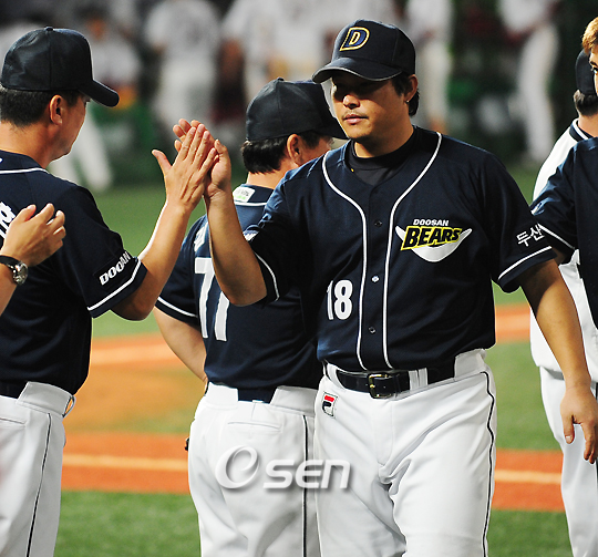 2008 삼성 PAVV 프로야구' 히어로즈와 두산 베어스의 경기가 6일 서울 목동구장에서 벌어졌다. 두산은 이날 경기에서 1회 선제 결승 만루홈런 포함 6타점을 작렬한 김동주와 7이닝 무실점으로 호투를 펼친 선발 이혜천의 활약에 힘입어 9-3으로 낙승을 거뒀다. 경기를 마치고 두산 김동주가 코치들과 하이파이브를 하고 있다./목동=민경훈 기자 rumi@osen.co.kr