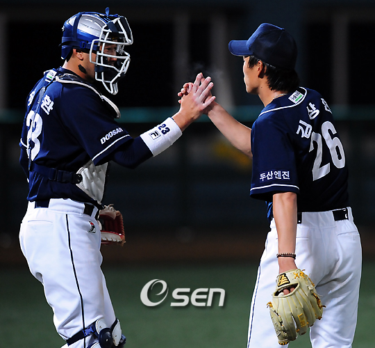 2008 삼성 PAVV 프로야구' 히어로즈와 두산 베어스의 경기가 6일 서울 목동구장에서 벌어졌다. 두산은 이날 경기에서 1회 선제 결승 만루홈런 포함 6타점을 작렬한 김동주와 7이닝 무실점으로 호투를 펼친 선발 이혜천의 활약에 힘입어 9-3으로 낙승을 거뒀다. 경기를 마치고 두산 최승환 포수와 김상현 투수가 하이파이브를 하고 있다./목동=민경훈 기자 rumi@osen.co.kr