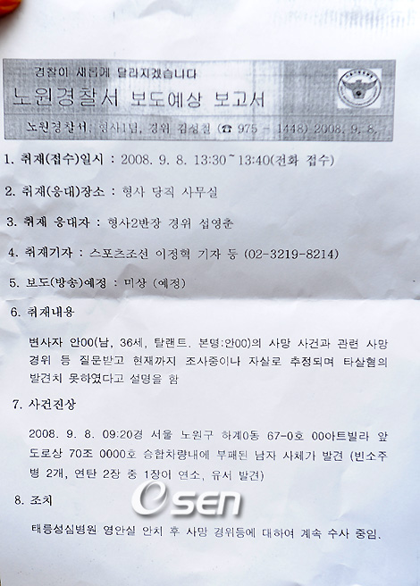 인기 MC 정선희의 남편이자 탤런트인 안재환(36)이 8일 오전 9시 20분께 서울 노원구 하계1동 주택가 골목에 세워져있던 승합차 안에서 숨진 채 발견됐다. 경찰은 숨진 안씨의 시신 옆에서 유서와 화로, 연탄 두 장 등이 발견된 정황으로 미루어 자살로 추정하고 있다. 시신을 처음 발견한 노원경찰서측의 사건취재보고서가 언론에 공개되고 있다./김영민 기자ajyoung@osen.co.kr