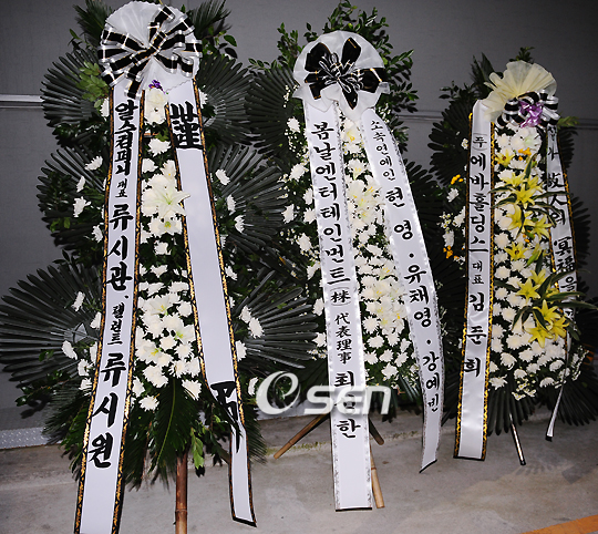 인기 MC 정선희의 남편이자 탤런트인 안재환(36)이 8일 오전 9시 20분께 서울 노원구 하계1동 주택가 골목에 세워져있던 승합차 안에서 숨진 채 발견됐다. 경찰은 숨진 안씨의 시신 옆에서 유서와 화로, 연탄 두 장 등이 발견된 정황으로 미루어 자살로 추정하고 있다. 시신이 안치된 태능 마이크로병원(구 성심병원) 장례식장에 동료 연예인들의 근조 화환이 자리를 지키고 있다./민경훈 기자rumi@osen.co.kr
