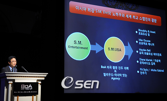 '아시아의 별' 가수 보아(22)가 10일 오후 서울 강남구 임피리얼 팰리스 호텔에서 미국 진출 관련 기자회견 '베스트 오브 아시아, 브링 온 아메리카(Best of Asia, Bring on America!)'를 열었다. 이 자리에는 보아, 이수만 SM 엔터테인먼트 대표를 비롯해 미국 진출 및 음반 제작 관련 스태프가 참석해 그 동안 극비리에 준비해 온 미국 진출 준비과정과 향후 계획 그리고 미국 데뷔곡을 최초 공개했다. 이수만 대표가 직접 미국 진출 준비과정을 설명하고 있다./민경훈 기자 rumi@osen.co.kr