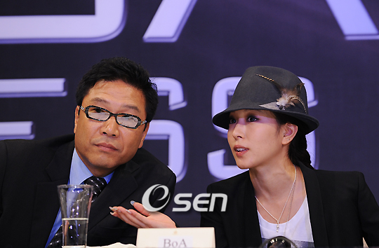 '아시아의 별' 가수 보아(22)가 10일 오후 서울 강남구 임피리얼 팰리스 호텔에서 미국 진출 관련 기자회견 '베스트 오브 아시아, 브링 온 아메리카(Best of Asia, Bring on America!)'를 열었다. 이 자리에는 보아, 이수만 SM 엔터테인먼트 이사를 비롯해 미국 진출 및 음반 제작 관련 스태프가 참석해 그 동안 극비리에 준비해 온 미국 진출 준비과정과 향후 계획 그리고 미국 데뷔곡'Eat You Up'을 최초 공개했다. 보아와 이수만 SM회장이 기자회견 중 얘기를 나누고 있다./민경훈 기자 rumi@osen.co.kr