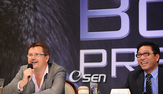 '아시아의 별' 가수 보아(22)가 10일 오후 서울 강남구 임피리얼 팰리스 호텔에서 미국 진출 관련 기자회견 '베스트 오브 아시아, 브링 온 아메리카(Best of Asia, Bring on America!)'를 열었다. 이 자리에는 보아, 이수만 SM 엔터테인먼트 이사를 비롯해 미국 진출 및 음반 제작 관련 스태프가 참석해 그 동안 극비리에 준비해 온 미국 진출 준비과정과 향후 계획 그리고 미국 데뷔곡'Eat You Up'을 최초 공개했다. 미국 프로듀서가 보아가 미국 유명 여가수들보다 훨씬 아름답다고 하자 이수만이 옆에서 환하게 웃고 있다./민경훈 기자 rumi@osen.co.kr