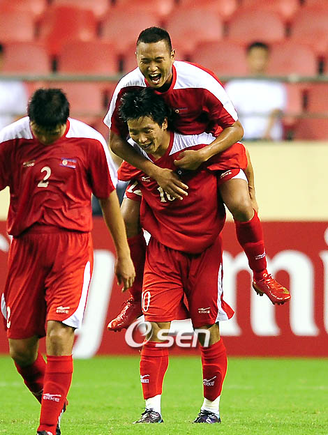 김정훈 감독이 이끄는 북한 축구국가대표팀은 10일 중국 상하이 훙커우 스타디움에서 열린 한국과 2010 남아공월드컵 아시아 최종예선 B조 2차전서 1-1 무승부를 기록했다. 이날 경기에서 북한은 당초 밀집 수비를 바탕으로 웅크리기만 할 것이라는 예상을 깨고 경기 흐름에 따라 공수 강도를 조절하며 후반 한때 한국에 1-0으로 앞서며 예상 외의 강한 전력을 선보였다. 이날 경기가 끝난 뒤 '인민 루니' 정대세(24, 가와사키)는 "수비 전술로 잘 싸웠다. 감독의 지시를 따로 받은 것은 없다"면서 "수비에 가담하되 공격은 자유롭게 하라고 얘기를 들었다"고 자신의 역할에 대해 설명했다. 또 홍영조(26, 로스토프)는 "한국 수비가 굉장히 빨랐다"고 짧게 대답했다. 러시아 이적 후 괄목할 만한 성장을 하고 있는 홍영조는 이날 북한의 측면 공격을 이끌며 존재감을 유감없이 발휘했다. 한편 K리그서 뛰고 있는 안영학(30, 수원)은 "한국이랑 몇 차례 경기를 해보았지만 선제골은 처음이었다"면서 "이길 줄 알았는데 아쉽게 비기고 말았다. 그러나 승점 1점을 따내 기쁘다"고 말했다. 이어 그는 "한국은 김남일을 비롯한 노장과 기성용, 김두현 등 젊은 선수들이 잘 어우러진 팀이다"고 설명했다. 이번 무승부로 1승1무 승점 4점을 기록, 최종예선 B조 1위를 지킨 북한은 오는 10월 15일 테헤란 원정길에 올라 중동의 강호 이란과 3차전을 치른다. bbadagun@osen.co.kr 홍영조가 페널티킥으로 선제골을 성공시키자 정대세가 등에 올라타 좋아하고 있다./상하이=손용호 기자spjj@osen.co.kr