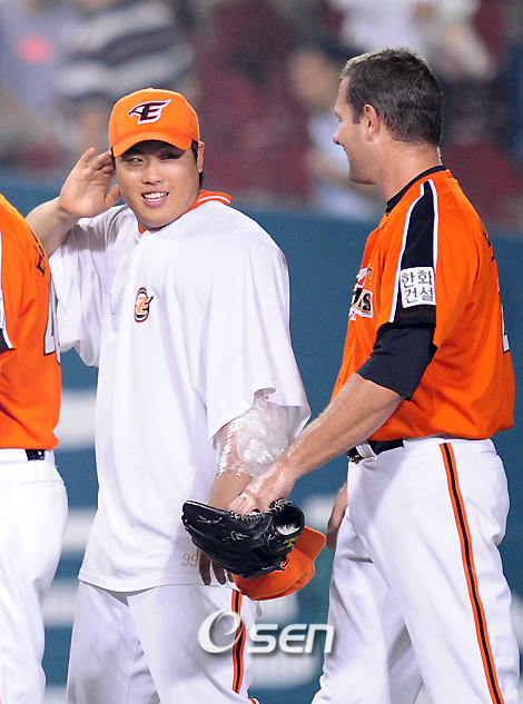 믿음직한 선발 투수가 있다는 점은 언제나 든든하다. 류현진(21. 한화 이글스)이 팀의 4연패를 끊는 귀중한 승리를 올리며 다시 한 번 '연패 스토퍼'가 되었다. 류현진은 11일 잠실구장서 열린 LG 트윈스와의 경기에 선발로 등판, 8이닝 동안 101개의 공을 던지며 3피안타(사사구 1개, 탈삼진 8개) 1실점으로 호투를 펼치며 시즌 13승(6패, 11일 현재)째를 거두는 위력을 발산했다. 이날 승리로 류현진은 프로 데뷔 후 3년 연속 15승 달성을 위해 한 걸음 더 나아갔다. 에이스 다운 역할을 확실하게 해낸 류현진은 경기 후 "팀의 연패를 마감시켜 기분이 좋다. 앞으로 팀이 상승세를 탈 수 있었으면 좋겠다"라며 자신의 승리보다 연패 사슬을 끊었다는 데에 의의를 두었다. 3년 연속 15승 달성 여부에 대해 묻자 그는 "앞으로 2~3번 정도의 등판 기회가 남아있는 데 포스트시즌 진출을 위해 승리가 꼭 필요한 상황이다. 앞으로 열심히 하겠다"라며 다짐을 밝혔다. "직구와 슬라이더 등을 주로 던졌다. 신경현(33) 선배가 좋은 투수 리드를 펼쳐 주었다"라며 배터리로 호흡을 맞춘 신경현에게 감사의 뜻을 밝힌 류현진은 "김광현(20. SK)이 14승으로 다승 부문서 앞서 있다. 다소 힘들지도 모르겠지만 앞으로 열심히 하면서 좋은 활약을 펼치면 타이틀도 따라오지 않을 까 싶다"라며 다승왕 타이틀에 대한 희망을 숨기지 않았다. 한편 이날 경기 후 LG는 이날 경기 후 외국인 타자 로베르토 페타지니(37)의 조기 귀국 소식을 알렸다. 지난 5월 우완 제이미 브라운(31)을 대신해 LG의 새 외국인 선수로 한국 땅을 밟은 페타지니는 66경기에 출장해 3할4푼6리 7홈런 35타점(11일 현재)을 기록하며 탁월한 선구안과 정확한 타격을 자랑했다. 그러나 최근 페타지니는 왼쪽 발바닥에 통증을 호소하며 선발 라인업서 제외되는 등 벤치를 지켰다. 페타지니는 부상을 조기 치료하기 위해 오는 15일 미국으로 출국하게 되었다. farinelli@osen.co.kr '2008 삼성 PAVV 프로야구' LG 트윈스와 한화 이글스의 경기가 11일 잠실구장에서 벌어졌다. 5-1로 승리를 거둔 한화 토마스와 류현진 대화를 나누고 있다./잠실=윤민호 기자 ymh@osen.co.kr