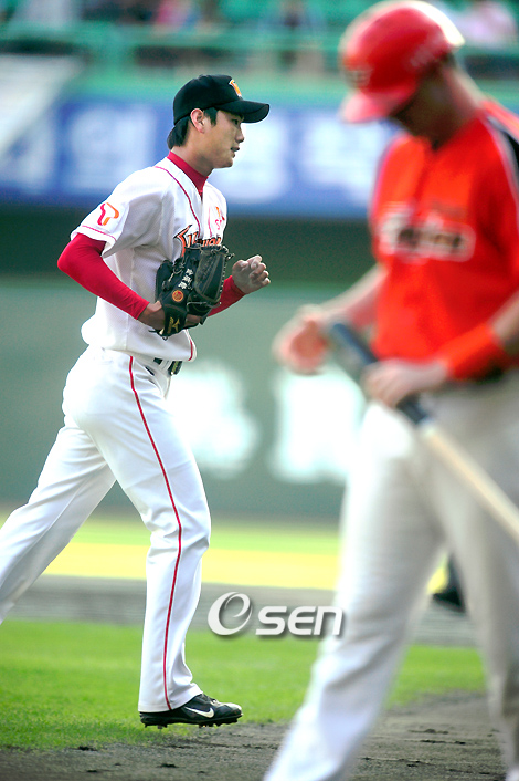 '2008 삼성 PAVV 프로야구' 선두를 독주하고 있는 SK 와이번스와 4위 삼성에 1.5게임을 뒤지고 있는 한화 이글스의 경기가 14일 민족 고유의 명절인 한가위에 인천 문학야구장에서 벌어졌다. 2회초 SK 김광현이 한화 김태균 김태완 클락을 차례로 삼진으로 처리하고 고개를 숙인 클락을 지나 덕아웃으로 향하고 있다./문학=손용호 기자spjj@osen.co.kr