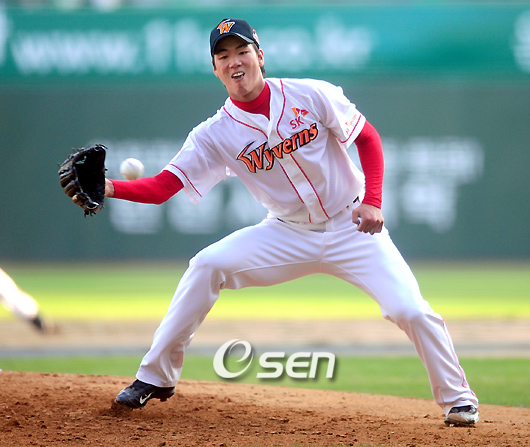'2008 삼성 PAVV 프로야구' 선두를 독주하고 있는 SK 와이번스와 4위 삼성에 1.5게임을 뒤지고 있는 한화 이글스의 경기가 14일 민족 고유의 명절인 한가위에 인천 문학야구장에서 벌어졌다. 3회초 1사 1,3루 SK 김광현이 한화 송광민의 타구에 글러브를 뻗었으나 안타가 되며 선취점을 내주고 있다./문학=손용호 기자spjj@osen.co.kr