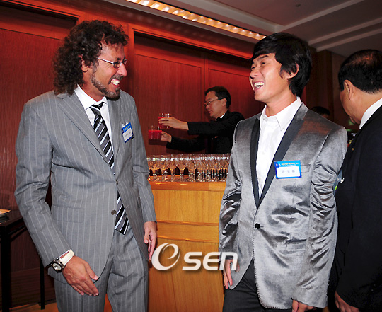대한축구협회 창립 75주년을 맞아 창립 기념일 전날인 18일 저녁 소공동 롯데호텔 크리스탈볼룸에서 정몽준 축구협회장과 이누카이 모토아키 일본축구협회장, 피터 벨라판 전 아시아축구연맹 사무총장 등 국내외 축구계 인사가 참석한 가운데 전야제가 열렸다. 행사에 앞서 J리그에서 활약했던 라모스와 윤정환이 웃음꽃을 피며 이야기를 하고 있다./김영민 기자ajyoung@osen.co.kr