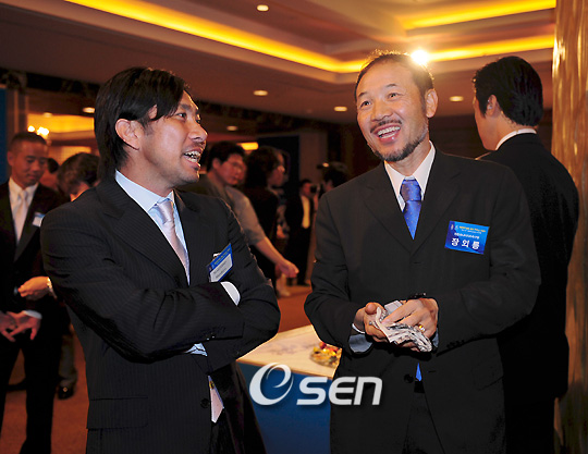 대한축구협회 창립 75주년을 맞아 창립 기념일 전날인 18일 저녁 소공동 롯데호텔 크리스탈볼룸에서 정몽준 축구협회장과 이누카이 모토아키 일본축구협회장, 피터 벨라판 전 아시아축구연맹 사무총장 등 국내외 축구계 인사가 참석한 가운데 전야제가 열렸다. 행사에 앞서 장외룡 감독이 한국에서도 뛰었던 마에조노 마사키요와 이야기를 나누고 있다./김영민 기자ajyoung@osen.co.kr