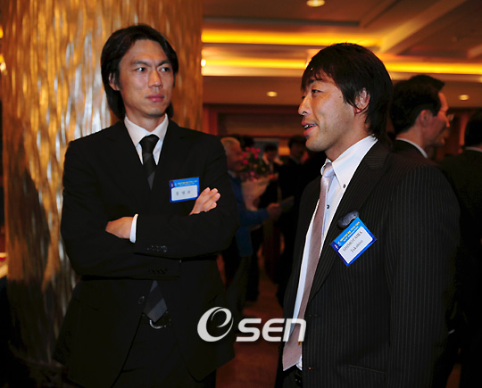 대한축구협회 창립 75주년을 맞아 창립 기념일 전날인 18일 저녁 소공동 롯데호텔 크리스탈볼룸에서 정몽준 축구협회장과 이누카이 모토아키 일본축구협회장, 피터 벨라판 전 아시아축구연맹 사무총장 등 국내외 축구계 인사가 참석한 가운데 전야제가 열렸다. 행사에 앞서 J리그 시절 같은 팀에서 활약했던 홍명보와 시모타이라 다카히로가 이야기를 나누고 있다./김영민 기자ajyoung@osen.co.kr