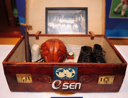 대한축구협회 창립 75주년을 맞아 창립 기념일 전날인 18일 저녁 소공동 롯데호텔 크리스탈볼룸에서 정몽준 축구협회장과 이누카이 모토아키 일본축구협회장, 피터 벨라판 전 아시아축구연맹 사무총장 등 국내외 축구계 인사가 참석한 가운데 전야제가 열렸다. 1954년 스위스 월드컵에 출전한 고 주영광 씨가 해외 전지훈련 때 갖고 다닌 가방과 물품들이 전시돼 있다./김영민 기자ajyoung@osen.co.kr