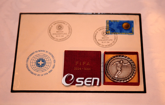 대한축구협회 창립 75주년을 맞아 창립 기념일 전날인 18일 저녁 소공동 롯데호텔 크리스탈볼룸에서 정몽준 축구협회장과 이누카이 모토아키 일본축구협회장, 피터 벨라판 전 아시아축구연맹 사무총장 등 국내외 축구계 인사가 참석한 가운데 전야제가 열렸다. 행사장 전시관에 1954년 스위스 월드컵 참가 기념 메달이 전시돼 있다./김영민 기자ajyoung@osen.co.kr