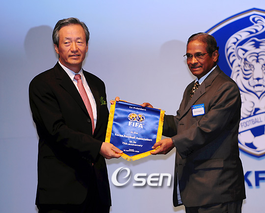 대한축구협회 창립 75주년을 맞아 창립 기념일 전날인 18일 저녁 소공동 롯데호텔 크리스탈볼룸에서 정몽준 축구협회장과 이누카이 모토아키 일본축구협회장, 피터 벨라판 전 아시아축구연맹 사무총장 등 국내외 축구계 인사가 참석한 가운데 전야제가 열렸다. 정몽준 축구협회장이 피터 벨라판 전 아시아축구연맹 사무총장과 창립 75주년 기념 페넌트를 들고 포즈를 취하고 있다./김영민 기자ajyoung@osen.co.kr