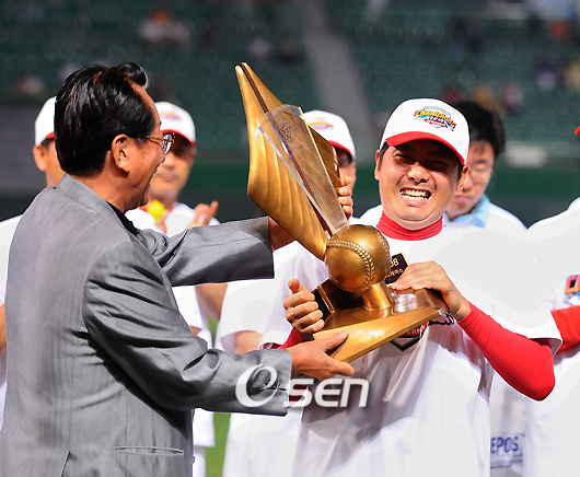 "(이)호준이가 트로피를 받았어야 하는데…". SK 김원형(36)이 주장으로서 기쁨보다는 진한 아쉬움을 토로했다. 김원형은 21일 문학 KIA전에서 2-1로 승리, 주장 자격으로 2년 연속 페넌트레이스 우승컵을 들어올렸다. 지난해는 정식 주장이었지만 올해는 이호준이 부상으로 이탈, 대리 주장 자격으로 수상했다. 그러나 김원형은 오히려 담담하면서도 미안한 표정을 지었다. 특히 부상으로 주장 자리를 내놓아야 했던 이호준의 부재를 안타깝게 생각했다. 지난 시즌 "주장으로서 자신의 역할을 제대로 못했다"고 입버릇처럼 말해왔듯 이호준이 느끼고 있을 기쁨과 안타까움을 헤아리는 모습이었다. 김원형은 "2연패를 해서 상당히 기쁘지만 호준이가 트로피를 받았어야 하는데…"라며 말끝을 흐린 뒤 "호준이가 빨리 나아서 한국시리즈 때 함께 뛰어 나 대신에 우승의 헹가래를 받았으면 하는 바람"이라고 소감을 밝혔다. 이밖에 SK 신영철 사장을 비롯한 선수들은 2연패를 해낸 데 대한 기쁨과 한국시리즈에 대한 각오를 숨김없이 드러냈다. ◀신영철 사장 "창단한지 얼마 되지 않았는데 페넌트레이스 2연패를 했다니 너무 기쁘다. SK 팬 여러분의 성원 덕분이다. 선수들도 잘해줬고 자랑스럽고 대견스럽다. 명문구단으로 거듭날 수 있도록 최선을 다하겠다". ◀박경완 "너무 기분이 좋아서 말이 제대로 나오지 않는다. 한국시리즈 우승으로 보답하겠다". ◀채병룡 "팀이 하나로 뭉쳐서 얻은 결과라고 생각한다. 너무 기쁘다. 남은 경기에서도 유종의미를 거둘 수 있도록 좋은 모습으로 보답하겠다. 한국시리즈에 대비해 훈련을 열심히 해 페넌트레이스의 2연패를 헛되지 않도록 하겠다." ◀정근우 "기분이 좋지만 다 잊고 내일부터 다시 한국시리즈 우승을 위해 훈련하겠다". ◀최정 "2년 연속 우승할 수 있어 너무나 큰 영광인 것 같다. 큰 고비를 넘겼다고 생각하고 남은 경기 동안 최선을 다해 좋은 기록으로 시즌을 마치고 싶다. 한국시리즈에서 최근 활약한 것처럼 결정적인 순간에 한 방 쳐주는 해결사 역할을 하고 싶다". ◀김재현 "동료선수들이 정말 자랑스럽다. 한국시리즈 우승까지 열심히 하겠다". ◀김광현 "2년 연속 우승을 해 기쁘다. 또 승리를 만들어 낸 게 스스로 자랑스럽다. 아직 좋아하기는 이르다. 한국시리즈에서 우승한 뒤에 기뻐하겠다". letmeout@osen.co.kr 2008 삼성 PAVV 프로야구' 21일 벌어진 경기서 SK 와이번스가 KIA 타이거즈에 2-1로 승리 77승 37패로 페넌트 레이스 2년 연속 1위를 확정지었다. 김원형 주장이 신상우 KBO 총재로 부터 우승컵을 받아 들고 있다./문학=손용호 기자spjj@osen.co.kr