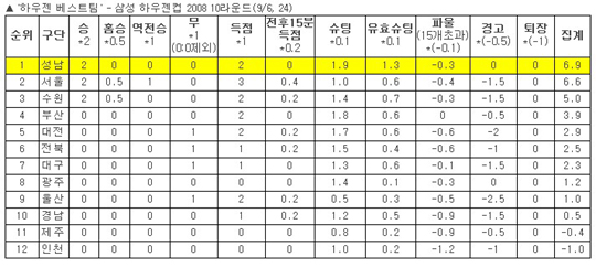 성남 일화가 시즌 5번째 ‘하우젠 베스트팀’에 선정됐다. 한국프로축구연맹은 25일 "성남이 삼성 하우젠컵 2008 10라운드 경기가 열린 지난 24일 저녁 광주를 상대로 김동현(성남)이 후반 40초와 30분에 연달아 터트린 2골(×1)에 힘입어 승리(×2)를 거둬 하우젠 베스트팀에 선정됐다"고 전했다. 광주를 2-0으로 격파한 성남은 하우젠컵 10라운드 경기를 치른 열두팀 가운데 가장 많은 19회(×0.1)의 슈팅과 13회(×0.1)의 유효슈팅으로 점수를 보탰고 경고와 퇴장 항목에서는 실점이 없어 베스트팀에 뽑혔다. 이로써 성남은 총 6.9점으로 2위에 오른 서울(6.6점)을 누르고 1위를 차지했고 지난 하우젠컵 6,7라운드와 하우젠 K-리그 13,14라운드에 이어 올 시즌 다섯 번째 선정됐다. 한편‘하우젠 베스트팀’은 공격적이고 박진감 넘치는 경기를 유도하기 위해 주관적인 평가를 배제한 가산점 제도로 2007년부터 매 라운드별로 선정해왔으며 라운드별 경기를 모두 마친 다음날에 발표한다. 7rhdwn@osen.co.kr