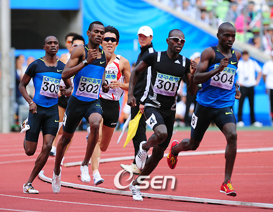베이징올림픽 남자 육상 800m 금메달리스트 윌프레드 번게이(케냐)가 2008 대구국제육상대회에서 대회신기록으로 정상에 올랐다. 번게이는 25일 대구스타디움에서 열린 이 대회 800m 결승에서 1분 47초 02에 결승선을 끊어 2위 저스티스 코에치(케냐, 1분 47초 05), 3위 모하메드 알 살히(사우디아라비아, 1분 47초 73)를 제치고 금빛 골인에 성공했다. 초반 코에치와 알 살히에 비해 늦었던 번게이는 막판 폭발적인 스퍼트로 지난 2005년 자신이 세운 1분 47초 40을 0.38초 앞당기는 놀라운 레이스를 펼쳤다. 한편 한국의 강석영, 김재열, 박성수 등은 상위권 진입에 실패하며 세계육상의 높은 벽을 다시 한 번 실감했다. stylelomo@osen.co.kr 번게이(301번)가 막판에 스퍼트하고 있다./대구=김영민 기자ajyoung@osen.co.kr