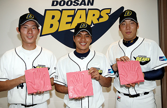 두산 베어스(사장 김진)의 이종욱(28), 고영민(24), 김현수(20) 선수가 25일 잠실 히어로즈와의 홈경기에 앞서 2008 베이징 올림픽 메달 리스트 핸드 프린팅을 실시했다. 이번 핸드 프린팅은 국민 체육 진흥공단에서 2008 베이징 올림픽 메달 리스트 총 51명의 핸드프린팅 동판을 제작해 서울올림픽 기념관 광장 앞에 전시된다. 특히 이날 제작된 핸드 프린팅 동판은 연간 10만 여명의 청소년이 찾는 서울올림픽 기념관에 역대 올림픽 메달 리스트들의 핸드 프린팅과 함께 전시되어 청소년들에게 꿈과 희망을 심어줄 예정이다. 이날 히어로즈 소속으로 금메달 주역이 된 이택근(28), 장원삼(25) 또한 핸드 프린팅 행사에 참여했다. 한편 베이징 올림픽에 함께 참가했던 주포 김동주(32)는 지난 2006년 3월에 홍성흔과 함께 2000년 시드니 올림픽 동메달 리스트로 핸드 프린팅을 실시한 바 있다. farinelli@osen.co.kr 두산 베어스 제공.