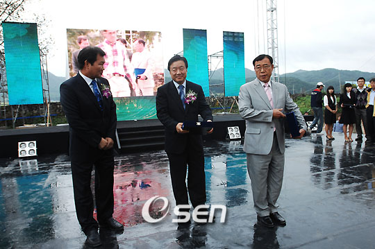 우리나라 한우 농가들의 축제 ‘제 8회 전국 한우인의 날’ 행사가 25일 강원도 홍천군 홍천읍 결운리에서 열렸다. 한우 산업을 안정시키고 농촌의 미래를 보장할 수 있는 길을 찾기 위해 마련된 이날 행사에서 한우인들은 ‘한우산업 미래비전 선포식’을 갖고 브랜드육 시식회를 여는 등 한우 브랜드의 우수성을 홍보했다. 공식행사에서 남호경 한우협회장(맨 왼쪽)이 SBS 드라마 ‘식객’을 제작한 JS픽쳐스 이효정 부사장에게 감사패를 전달하는 식을 치르고 있다. 한우협회는 드라마 ‘식객’이 한우의 우수성을 널리 알리는데 일조했다며 감사했다. 맨 오른쪽은 이천시장을 대신해 참석한 최흥기 이천시 산업환경국장. /홍천=강희수 기자 100c@osen.co.kr