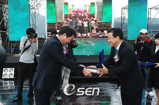 우리나라 한우 농가들의 축제 ‘제 8회 전국 한우인의 날’ 행사가 25일 강원도 홍천군 홍천읍 결운리에서 열렸다. 한우 산업을 안정시키고 농촌의 미래를 보장할 수 있는 길을 찾기 위해 마련된 이날 행사에서 한우인들은 ‘한우산업 미래비전 선포식’을 갖고 브랜드육 시식회를 여는 등 한우 브랜드의 우수성을 홍보했다. 공식행사에서 남호경 한우협회장(왼쪽)이 SBS 드라마 ‘식객’을 제작한 JS픽쳐스 이효정 부사장에게 감사패를 전달하고 있다. 한우협회는 드라마 ‘식객’이 한우의 우수성을 널리 알리는데 일조했다며 감사했다. /홍천=강희수 기자 100c@osen.co.kr