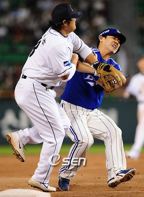 김동주(32. 두산 베어스)가 또다시 경기 도중 부상으로 인해 교체되었다. 김동주는 26일 잠실 삼성 라이온즈전에 4번 타자 겸 3루수로 출장, 4회초 수비 도중 현재윤(29)의 중견수 플라이에 3루로 쇄도하던 2루 주자 박진만(31)과 충돌하며 부상을 입었다. 김동주는 곧바로 김재호(23)에게 3루를 맡기고 교체되었다. 팀 관계자의 부축을 받으며 덕아웃으로 향한 김동주는 오른쪽 골반 타박상으로 인해 얼음 찜질과 동시에 휴식을 취하고 있다. 두산 구단 관계자는 "오른쪽 골반에 타박상을 입었다. 당시 충격으로 인해 오른쪽 다리를 들면서 골반에 통증을 호소해 부득이하게 교체할 수 밖에 없었다"라고 밝혔다. farinelli@osen.co.kr '2008 삼성 PAVV 프로야구' 두산 베어스와 삼성 라이온즈의 경기가 26일 잠실구장에서 벌어졌다. 4회초 1사 주자 1,2루 삼성 현재윤의 중견수 플라이 아웃직후 2루 주자 박진만이 3루로 뛰면서 두산 3루수 김동주와 충돌을 하고 있다./잠실=민경훈 기자rumi@osen.co.kr