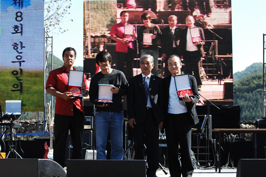 위기에 처한 한우인들이 정치인들과 함께 강원도 홍천에서 ‘우리 한우를 지키자’며 한 목소리를 냈다. 지난 25, 26일 이틀간 ‘한우 지켜야 할 자존심, 함께 할 미래’라는 주제로 한우인의 날 행사가 열려 국회의원과 정부, 전국의 한우인들이 하나로 단결하는 장이 되었다. 전국한우협회와 강원도지회 홍천군지부 주최로 열린 제 8회 한우인의 날 행사는 첫날에만 1만여 명이 참가한 가운데 한우산업을 반드시 지킨다는 결의를 다지는 자리가 되었다. 행사 첫 날에는 오후 3시 본 행사가 진행되기 직전에서야 비가 그치는 등 어려움을 겪기도 했지만 7000여 명의 한우인들과 다수의 국회의원, 농식품부, 각계 단체장 등이 대거 참석해 자리를 빛냈다. 국회 농해위 이낙연 위원장과 강기갑 민노당 대표, 이인기 의원, 황영철 의원, 박덕배 차관, 김진선 강원도지사, 노승철 홍천군수, 이승호 축단협회장, 강성원 명예회장 등이 본행사를 이끌었다. 김명재 강원도지회장의 ‘전국한우협회 창립9주년 기념 및 제8회 한우인의 날’ 개회 선언으로 시작된 이날 행사에서 노승철 홍천군수는 환영사를 통해 “전국의 한우농가 여러분과 이낙연 위원장님 등 국회의원, 내외귀빈이 참석한 가운데 한우인의 날 행사를 하게 되어 매우 기쁘게 생각하며 환영한다”고 밝혔다. 남호경 회장은 대회사를 통해 “오늘 한우인의 날 행사를 계기로 미래를 향해 힘차게 도전합시다. 우리가 단결해 지혜를 모은다면 이 땅위의 자존심, 한우는 지켜질 것이며 한우의 역사를 새롭게 창조해 나갈 것입니다”고 밝혔다. 박덕배 차관은 축사를 통해 “한우산업은 명품한우를 만들어 낸다면 세계 속에서 당당히 경쟁할 수 있는 산업이 될 것”이라고 격려하고 농식품부에서 한우산업 발전을 위한 T/F 팀을 만들어 운영하고 있다고 밝혔다. 정부와 한우농가가 손을 맞잡고 노력해 나간다면 한우고기가 소비자에게 사랑받고 한우산업도 안정될 것이라고 강조했다. 이낙연 위원장은 “축종 중에 유일하게 한우에만 ‘한국’자가 붙어 있다”며 “우리 민족의 한우산업을 지켜내지 못한다면 조상님들의 얼굴을 어떻게 볼 수 있겠냐”고 반문했다. “한우는 단순한 소가 아니라 한국인의 정서요, 생활이요, 영원”이라며 “한우를 지켜야만 한국인의 정서와 생활, 영원을 지키는 것”이라고 거듭 강조했다. 이 위원장은 또 앞으로 한우산업을 지키기 위해 정부에서 추진하고 있는 사료값 지원, 서울축공 도축기능 폐쇄 등에 대해 설명하는 등 장시간 연설해 뜨거운 박수갈채를 받았다. 강기갑 대표도 격려사를 통해 “사료값과 비료값, 기름값이 천장부지로 오르고 있는 상황에서 국회에서 FTA를 날치기로 통과시키려 하고 있다”며 “반드시 막아내야 한다”고 강조했다. 행사 참석자들의 연설에 이어 한우산업 발전을 위해 노력한 이들에 대한 장관상과 우수지부상, 감사패, 특별공로상 등을 전달하는 순서가 진행됐고 남호경 회장과 강성원 명예회장, 이규석 전회장 등이 한우산업의 미래 비전을 기원하는 시루떡을 절단하며 ‘한우산업의 미래 비전 선포식’을 가졌다. 26일 둘째날에는 ‘한우와 소비자와의 만남의 장’으로 꾸며졌다. 대도시 소비자들과 인근 춘천 시민 등 6000여 명이 운집한 가운데 한우 불고기시식회, 무료국밥 나눠주기 등의 프로그램이 치러졌다. 이날 프로그램들은 명품 한우고기의 맛을 알리는데 제 몫을 했으며 시식행사장 마다 “역시 이 맛이 한우맛이야”라는 찬사가 터져 나왔다. 또한 ‘쇠고기 대결’ 등으로 화제를 모았던 SBS 월화드라마 ‘식객’에 출연한 탤런트 양택조, 조상구, 강승범 등을 연예인 한우서포터스로 임명하고 위촉식도 열었다. 한우협회는 드라마 ‘식객’이 한우의 우수성을 널리 알리는데 일조했다며 위촉식과 함께 감사패를 전달했다. 100c@osen.co.kr 한우서포터스에 임명된 드라마 ‘식객’ 출연진.
