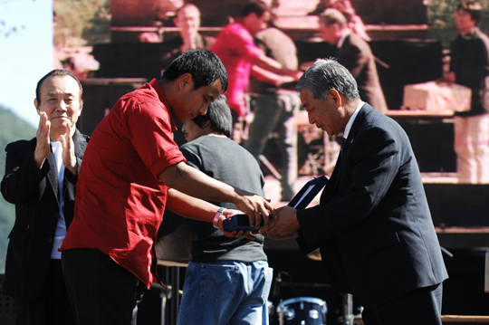 양택조 조상구 강승범 등 SBS 드라마 ‘식객’ 출연진이 25, 26일 양일간 강원도 홍천에서 열린 ‘제 8회 한우인의 날’ 행사에서 ‘연예인 한우서포터스’에 임명됐다. 강승범(왼쪽)이 김명재 한우협회 강원도지회장으로부터 위촉장을 받고 있다. /강희수 기자 100c@osen.co.kr