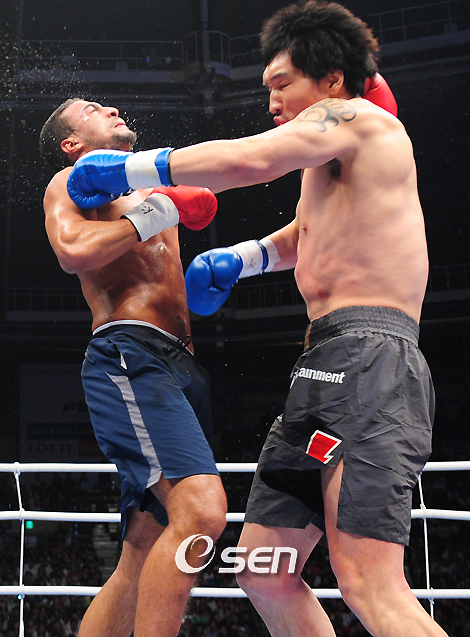 '테크노 골리앗' 최홍만(28)이 복귀전서 패배의 쓴 맛을 봤다. 27일 서울 올림픽공원에서 열린 'K-1 월드그랑프리 2008 파이널 16강전' 제7경기서 바다 하리(24, 모로코)와 대결한 최홍만은 3라운드를 마친 뒤 무승부가 선언되자 연장전 개시 직전 타월 투척으로 기권패를 당했다. 지난 6월 뇌하수체 종양 제거 수술을 받은 뒤 3개월 만에 링에 복귀한 최홍만은 여유있는 모습으로 경기장으로 입장했다. 수술 후 훈련을 하는 동안 20kg 체중 감량에 성공한 것으로 알려진 최홍만은 뜻밖의 일본풍 배경음악을 뒤로 하고 가슴에 'HM'이라는 자신의 이니셜이 써진 옷을 입고 링 위로 올라섰다. 반면 전날 가진 기자회견서 최홍만에게 '작고 귀여운 선수'라는 별칭을 만들며 '악동'의 모습을 선보인 바다 하리는 진지한 얼굴로 경기장에 입장했다. 218cm, 146kg의 최홍만은 198cm, 102kg의 바다 하리와 눈싸움을 애써 피하며 경기를 시작했다. 1라운드 초반 탐색전을 벌이던 양 선수 중 먼저 공격을 가한 쪽은 바다 하리였다. 그는 주변을 돌면서 로킥으로 최홍만을 꼼짝 못하게 했다. 최홍만은 가벼운 잽을 바탕으로 반격에 나섰지만 상대에 큰 타격을 주지 못했다. 로킥과 함께 펀치를 날린 바다 하리를 상대로 최홍만은 특별한 반격의 기회를 잡지 못했다. 최홍만은 바다 하리의 작전을 알면서도 스피드가 떨어지다보나 당할 수 밖에 없었다. 최홍만은 1라운드 막판 왼손 훅을 바다 하리의 얼굴에 적중시켰으나 상대의 로킥을 막아내지 못해 어려움을 겪으며 1라운드를 마쳤다. 2라운드 초반 최홍만은 바다 하리의 공격을 받아치며 좌우 카운터 연타로 다운을 뺏었다. 하지만 이내 안정을 되찾은 바다 하리는 로킥을 통해 최홍만의 왼쪽 다리를 공략했다. 또 바다 하리는 펀치를 통해 최홍만의 공격을 막아내며 2라운를 끝냈다. 최종 3라운드서 최홍만과 바다 하리는 모두 안정적인 탐색전을 펼쳤다. 연장전을 대비한 듯 체력을 아끼는 듯한 모습을 보였다. 특히 바다 하리는 유효타를 통해 득점을 쌓았고 3라운드 종료 결과 29-28(최홍만 우세), 28-28, 28-28로 무승부가 돼 연장에 돌입했다. 하지만 최홍만의 세컨드는 연장에 들어가기 전 타월을 던지며 경기를 포기했다. 10bird@osen.co.kr 최홍만이 2라운드서 하리를 다운시키고 있다./올림픽공원=윤민호 기자 ymh@osen.co.kr