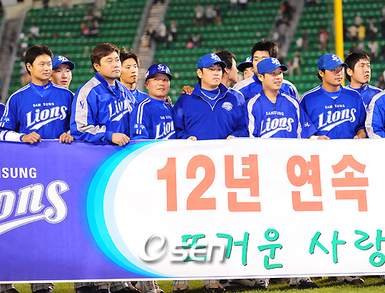 '2008 삼성 PAVV 프로야구' 두산 베어스와 삼성 라이온즈의 경기가 28일 잠실구장에서 벌어졌다. 이 날 경기에서 삼성은 2회 터진 양준혁의 2타점 결승 내야안타와 호쾌한 타격진에 힘입어 치열한 승부 끝에 10-9로 승리를 거뒀다. 또한 이 승리로 삼성이 적지서 두산 베어스를 꺾고 12년 연속 포스트 시즌 진출이라는 쾌거를 일궈냈다. 경기를 마치고 삼성 선수들이 '12년 연속 포스트 시즌 진출'을 축하하는 플렌카드를 들고 포토타임을 갖고 있다./잠실=민경훈 기자rumi@osen.co.kr