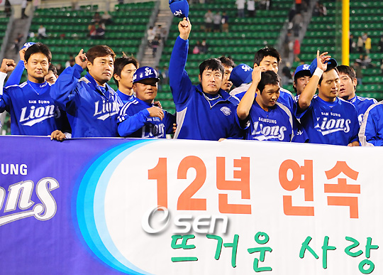 '2008 삼성 PAVV 프로야구' 두산 베어스와 삼성 라이온즈의 경기가 28일 잠실구장에서 벌어졌다. 이 날 경기에서 삼성은 2회 터진 양준혁의 2타점 결승 내야안타와 호쾌한 타격진에 힘입어 치열한 승부 끝에 10-9로 승리를 거뒀다. 또한 이 승리로 삼성이 적지서 두산 베어스를 꺾고 12년 연속 포스트 시즌 진출이라는 쾌거를 일궈냈다. 경기를 마치고 삼성 선수들이 '12년 연속 포스트 시즌 진출'을 축하하는 플렌카드를 들고 포토타임을 갖고 있다./잠실=민경훈 기자rumi@osen.co.kr