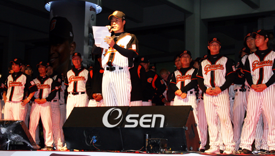"8년 만에 4강 진출에 성공했다. 다음 목표는 한국시리즈 우승이다". 8년 만에 가을 잔치에 참가하는 롯데 자이언츠가 세 번째 우승을 약속했다. 롯데 자이언츠는 28일 사직 KIA전이 끝난 뒤 야외 무대에서 'Restart Day'(플레이오프 출정식)를 개최했다. 이날 출정식은 ▲선수단 입장 ▲응원단 공연 ▲인터뷰 ▲Fighting Ball 전달 ▲선수단 대표 감사 인사 ▲Q&A ▲승리 기원 세레머니 ▲포토 타임 ▲선수단 퇴장으로 진행됐다. 제리 로이스터 롯데 감독은 "8년 만에 4강 진출에 성공했다. 다음 목표는 한국시리즈 우승이다"고 힘줘 말했다. 선수단 대표로 나선 조성환(32, 내야수)은 직접 쓴 편지를 읽으며 "우승으로 팬들의 성원에 보답하겠다"고 약속했다. 병역 비리에 연루돼 4년 만에 그라운드에 복귀한 조성환은 27일 현재 타율 3할2푼7리(453타수 148안타) 10홈런 81타점 78득점 30도루로 4년 공백을 무색케 했다. 선수들은 자신의 등장 음악이 나올 때마다 쑥쓰러운 표정을 지으며 따라 불렀다. 로이스터 감독과 강민호는 '롯데의 강민호'를 따라 부르며 하마 퍼포먼스를 연출했다. 서정근 롯데 홍보팀장은 "지난해까지 출정식마다 '내년에는 4강에 진출하겠다'는 약속만 했는데 올해 4강 진출을 확정짓고 팬들을 만나게 돼 너무 고맙고 뿌듯하다"고 말했다. 선수단과 팬들은 '부산 갈매기'를 열창하며 출정식을 마무리지었다. what@osen.co.kr 선수단 대표로 나선 조성환이 직접 쓴 편지를 읽고 있다.