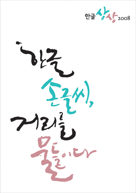 10월 9일 한글의 날, 한글이 만들어 낼 수 있는 2350자의 손글씨가 홍대거리를 요란스레 물들인다. 복합문화공간 KT&G 상상마당과 ㈜윤디자인연구소, 글책말 전시그룹은 ‘한글 상상 2008-한글 손글씨, 거리를 물들이다’라는 프로젝트의 사명감으로 대한민국 위대한 문화자산인 한글의 아름다움과 우수성을 알리기 위해 홍대 거리로 나섰다. 이번 프로젝트는 10월 9일 한글의 날을 맞아 한글이 만들어 낼 수 있는 2350자에 대한 일반인들의 관심을 높이기 위해 ‘글자’라는 아날로그적 논리를 ‘폰트’라는 디지털 감성으로 구현해 내는 행사다. 일반인들이 쉽게 익혀 쓰는데 편리하라고 만들어진 과학적인 한글의 신비로움과 아름다움을 일반인들과 함께 하고자 홍대 상상마당이 위치한 피카소 거리의 바닥을 한글 2350자로 페인팅하는 작업을 비롯해 손글씨 작가(캘리그라퍼) 강병인 씨의 퍼포먼스, 손 글씨로 엽서 보내기, 손 글씨로 꾸민 아트 월 등의 다양한 시민 참여 행사가 진행될 예정이다. 10월 9일부터 26일까지는 상상마당 아트마켓에서 손글씨작가와 디자이너들이 만나 한글을 주제로 한 ‘책이 되어 버린 한글 캘린더 2008 ’ 전시도 선보인다. 이번 행사는 한글이 가진 아름다움과 우수성, 그리고 잊고 있었던 손글씨라는 아날로그적 감성을 느낄 수 있는 좋은 기회를 제공한다. 영어공부에 찌든 우리 아이들에게 우리 글씨, 한글의 소중함을 알려줄 수 있는 교육의 장으로도 찾아볼 만한 좋은 기회가 될 듯하다. 자세한 내용은 상상마당 홈페이지(www.sangsangmadang.com)를 참고할 수 있다. jin@osen.co.kr ‘한글 상상 2008-한글 손글씨, 거리를 물들이다’로그.