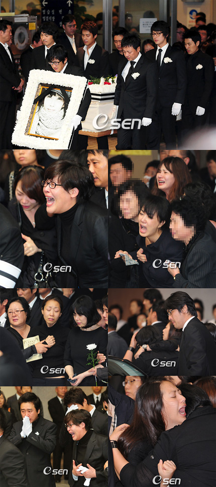 모두가 눈물범벅이었다. 유족들과 연기자 선후배들은 그렇게 고 최진실의 마지막 가는 길을 눈물로 배웅했다. 4일 오전 7시 15분께 고 최진실의 빈소가 마련된 서울 일원동 삼성서울병원 장례식장에서는 유가족을 비롯해 평소 고인과 절친했던 엄정화, 이영자, 이소라, 홍진경 등 지인들이 참석해 고인의 마지막 길을 눈물로 애도했다. 최진실의 전 남편 조성민도 고인의 뒤를 따르며 마지막을 지켰다. 영결식은 강남 중앙침례교회 피동민 목사의 집도하에 진행됐으며, 고인의 마지막 작품이 된 MBC TV '내생애 마지막 스캔들' OST 수록곡인 이은미의 '애인이 있어요'가 고인의 사진들을 엮은 추모 영상과 함께 흘러나와 보는 이들을 애통하게 했다. 8시 20분께 고인의 유해가 운구되면서 애통함은 극에 달했다. 동생 최진영이 눈시울을 붉힌 채 고인의 영정을 이끌었고 뒤이어 이광기 조연우 윤다훈 박해진 고주원이 운구를 했다. 뒤따른 유족들과 지인들은 ‘진실아 가지마’를 목청껏 외치며 고인의 죽음을 안타까워했다. '최진실 사단'으로 불리며 평소 최진실과 친자매처럼 지냈던 최화정 엄정화 이영자 정선희 홍진경 등은 오열을 금치 못했으며, 아이들이 이모라 부르며 따랐다는 탤런트 신애 또한 슬픔에 몸을 가누지 못했다. 고인의 유해를 운구한 이광기와 윤다훈은 시종일관 눈물을 흘리는 모습을 보였고, 조성민 또한 침울한 표정으로 눈물 지었다. 최 씨의 유해는 오전 10시 경기도 성남 영생원에서 화장된 뒤, 경기도 양수리 갑산공원 가족묘에 안치될 예정이다. yu@osen.co.kr