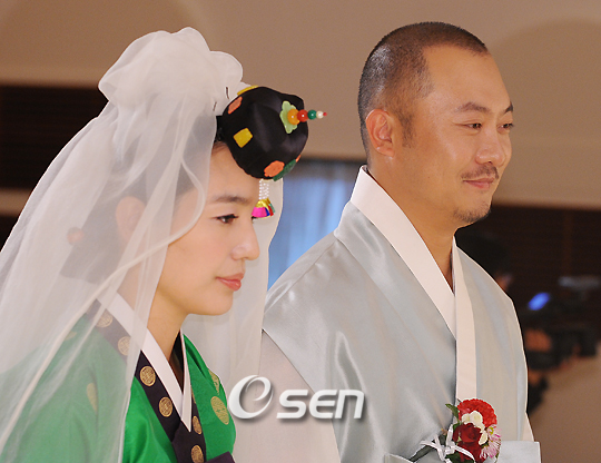 개그맨 염경환(36)의 결혼식이 5일 오후 서울 여의도 KT 컨벤션 웨딩홀에서 열렸다. 이 날 결혼식은 네 살배기 아들 은율과 아내 서현정(30)과 함께 '전통 퓨전'이라는 형식으로 한바탕 잔칫날을 만들기로 해 결혼식 전 과정을 공개했다. 이 날 결혼식의 사회로 지상렬, 주례 김병조, 축시 김구라, 축가 노사연과 박상민이 맡는다. 결혼식 중 염경환이 아내 옆에서 미소짓고 있다./민경훈 기자 rumi@osen.co.kr