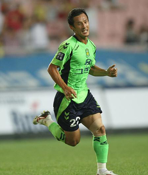 '무회전 키커' 김형범이 벼락 같은 슈팅으로 팀을 승리로 이끌었다. 최강희 감독이 이끄는 전북 현대가 5일 전주 월드컵경기장에서 열린 삼성 하우젠 K리그 2008 21라운드 제주 유나이티드와 경기서 후반 34분 터진 김형범의 전광석화 같은 중거리슛 결승골에 힘입어 2-1 승리를 거두었다. 이날 승리로 전북은 컵대회를 포함 5연승의 팀 최다연승 신기록을 질주하면서 정규리그 4연승으로 경남을 제치고 7위로 뛰어 올라 6위 인천을 승점 1차로 추격했다. 피말리는 6강 플레이오프 진입 경쟁을 벌이고 있는 전북과 제주는 초반부터 공격적인 전술을 통해 맞대결을 펼쳤다. 측면 돌파를 통해 문전에서 기회를 만드는 데 주력한 전북과 미드필드 진영에서 날카로운 패스 연결을 시도하며 중앙 돌파를 시도한 제주는 전술적으로 차이가 많았다. 지난 20라운드서 수원에 5-2의 대승을 거둔 전북은 초반부터 강하게 제주를 몰아쳤고 전반 20분 선취점을 뽑아냈다. 정경호가 상대 진영 왼쪽 돌파 후 문전으로 올린 볼을 조재진이 헤딩슈팅으로 연결했지만 골대 맞고 튀어 나왔다. 이 볼을 문전서 대기하던 최태욱이 멋진 터닝슈팅으로 제주의 골망을 흔들며 1-0으로 앞섰다. 기세가 오른 전북은 최태욱과 신광훈의 오른쪽 돌파가 살아나며 문전의 조재진에 많은 득점 기회를 만들기 위해 노력했다. 전북은 전반 28분 루이스의 패스를 받은 최태욱이 상대 수비 조용형의 파울로 얻은 페널티 킥 찬스를 키커 조재진이 실축하며 분위기가 가라 앉았으나 실점없이 전반을 마쳤다. 후반서도 전북의 공격은 계속됐다. 루이스와 최태욱이 빠른 돌파를 통해 문전으로 크로스를 올렸지만 번번이 상대 수비에 막혔고 후반 9분에는 정경호가 돌파 후 직접 슈팅을 시도했지만 골대를 벗어났다. 제주는 호물로를 중심으로 유기적인 패스 연결을 통해 기회를 만들었지만 중거리 슈팅은 힘이 실리지 않으며 번번이 득점 찬스를 살리지 못했다. 전북은 후반 12분과 18분에 각각 김형범과 다이치를 투입해 추가골을 노렸다. 제주는 후반 19분 외국인 선수 쏘자를 내보냈고 이어 후반 22분 구자철을 기용하며 전술 변화를 시도했다. 기회를 엿보던 제주는 후반 25분 동점골을 뽑아냈다. 전북 진영 왼쪽에서 올라온 코너킥을 문전에 있던 이정호가 방향을 바꾸며 슛, 1-1로 경기를 원점으로 돌렸다. 그러나 승리의 몫은 전북이었다. 후반 교체 투입된 김형범은 후반 34분 아크 정면에서 볼을 잡은 뒤 오른쪽으로 움직인 뒤 벼락같은 중거리 슈팅으로 결승골을 터트리며 전북이 2-1로 앞섰다. 이후 전북은 수비수 강민수를 투입하며 지키기에 나섰고 4연승에 성공했다. ■ 5일 전적 ▲ 전주 전북 현대 2 (1-0 1-1) 1 제주 유나이티드 △ 득점 = 전 20 최태욱 후 34 김형범(전북) 후 25 이정호(제주) 10bird@osen.co.kr 김형범 = 전북 현대 제공.