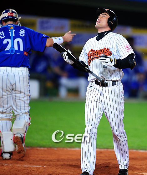 롯데 자이언츠 주장 조성환(32, 내야수)은 거인 군단의 4강 진출 주역. 조성환은 정규 시즌 123경기서 타율 3할2푼7리(462타수 151안타) 10홈런 81타점 79득점 31도루로 롯데 타선에 활력을 불어 넣었다. 선동렬 삼성 감독은 지난 7일 준PO 미디어 데이에서 김주찬과 조성환을 경계 대상 1호로 지목할 만큼 삼성전에 강한 면모를 드러냈다. 조성환의 삼성전 성적은 타율 3할8리(65타수 20안타) 14타점 9득점. 선 감독은 "발 빠른 주자들이 나가면 곤란해진다. 김주찬과 조성환이 그래서 위협적"이라며 "주자 있을 때와 그렇지 않을 때 중심 타자들을 상대하는 것에서 많은 차이가 날 수밖에 없다. 이들을 잡아야 승산이 있다"고 말했다. 그러나 가을 잔치에 나선 조성환은 무기력 그 자체. 득점 찬스마다 맥없이 물러나며 고개를 떨궜다. 8일 사직구장에서 열린 삼성과의 준PO 1차전서 4타수 무안타에 그친 조성환은 9일 2차전에서도 이렇다할 모습을 보여주지 못했다. '테이블세터' 김주찬-이인구가 수 차례 득점 찬스를 마련했으나 불발. 믿었던 조 반장의 부진에 팬들은 아쉬움 가득한 탄식을 쏟아냈다. 1회 1사 1루서 헛스윙 삼진으로 물러난 조성환은 0-1로 뒤진 3회 김주찬의 우전 안타, 이인구의 좌중간 안타로 만든 무사 1,3루서 헛스윙 삼진으로 고개를 떨궜다. 5회 무사 1,3루서도 유격수 앞 병살타. 3루 주자 김주찬이 홈을 밟아 2-2 승부는 원점으로 되돌렸지만 아쉬움은 감출 수 없었다. 7회 2사 1,2루서 네 번째 타석에 들어선 조성환의 방망이는 허공을 갈랐다. 이어 9회 2사 2루서 우익수 뜬공으로 아웃됐다. 이틀 연속 삼성에 덜미를 잡힌 롯데 자이언츠가 반전을 노리기 위해 조성환의 부진 탈출은 필수 요건이다. what@osen.co.kr '2008 삼성 PAVV 프로야구 준플레이오프' 롯데 자이언츠와 삼성 라이온즈의 2차전이 9일 부산 사직야구장에서 열렸다. 중심타선에 위치 찬스마다 번번이 헛스윙을 연발한 조성환이 7회말 2사 1,2루의 찬스서도 삼진으로 물러나고 있다./부산=손용호 기자spjj@osen.co.kr
