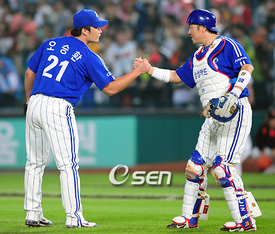 '2008 삼성 PAVV 프로야구 준플레이오프' 롯데 자이언츠와 삼성 라이온즈의 2차전이 9일 부산 사직야구장에서 열렸다. 이 날 경기에서 삼성은 2-2로 팽팽한 접전을 펼치다가 7회 터진 박진만의 짜릿한 2타점 결승 2루타를 앞세워 4-3으로 롯데에게 승리를 거두었다. 경기를 마치고 삼성 오승환 투수와 진갑용 포수가 기쁨을 나누고 있다./부산=민경훈 기자rumi@osen.co.kr