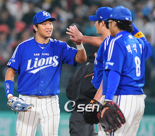 '2008 삼성 PAVV 프로야구 준플레이오프' 롯데 자이언츠와 삼성 라이온즈의 2차전이 9일 부산 사직야구장에서 열렸다. 이 날 경기에서 삼성은 2-2로 팽팽한 접전을 펼치다가 7회 터진 박진만의 짜릿한 2타점 결승 2루타를 앞세워 4-3으로 롯데에게 승리를 거두었다. 경기를 마치고 삼성 채태인과 오승환 투수가 하이파이브를 하고 있다./부산=민경훈 기자rumi@osen.co.kr
