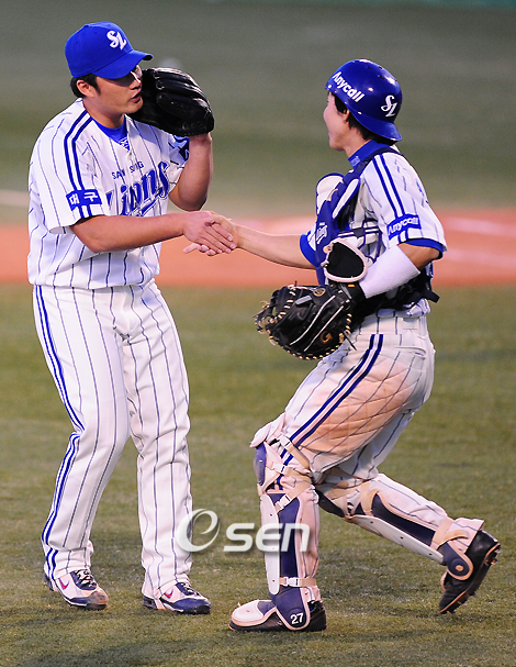 '2008 삼성 PAVV 프로야구 준플레이오프' 삼성 라이온즈와 롯데 자이언츠의 3차전이 11일 대구구장에서 벌어졌다. 이 날 삼성은 롯데와 4-4로 팽팽하게 맞서다가 8회 조동찬의 2타점 결승타에 힘입어 6-4로 승리했다. 반면 롯데는 8년 만에 가을 잔치에 나섰으나 힘 한 번 제대로 쓰지 못하며 패했다. 경기를 마치고 삼성 오승환 투수와 현재윤 포수가 악수를 나누고 있다./대구=민경훈 기자rumi@osen.co.kr