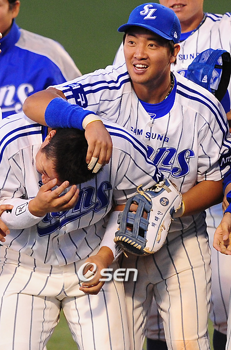 '2008 삼성 PAVV 프로야구 준플레이오프' 삼성 라이온즈와 롯데 자이언츠의 3차전이 11일 대구구장에서 벌어졌다. 이 날 삼성은 롯데와 4-4로 팽팽하게 맞서다가 8회 조동찬의 2타점 결승타에 힘입어 6-4로 승리했다. 반면 롯데는 8년 만에 가을 잔치에 나섰으나 힘 한 번 제대로 쓰지 못하며 패했다. 경기를 마치고 삼성 채태인이 최형우와 승리의 기쁨을 나누고 있다./대구=민경훈 기자rumi@osen.co.kr