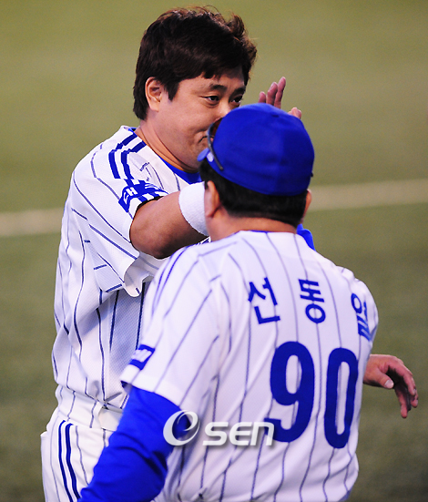 '2008 삼성 PAVV 프로야구 준플레이오프' 삼성 라이온즈와 롯데 자이언츠의 3차전이 11일 대구구장에서 벌어졌다. 이 날 삼성은 롯데와 4-4로 팽팽하게 맞서다가 8회 조동찬의 2타점 결승타에 힘입어 6-4로 승리했다. 반면 롯데는 8년 만에 가을 잔치에 나섰으나 힘 한 번 제대로 쓰지 못하며 패했다. 경기를 마치고 삼성 양준혁이 선동렬감독과 하이파이브를 하고 있다./대구=민경훈 기자rumi@osen.co.kr