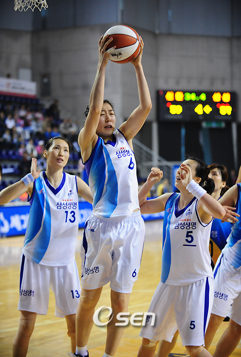 '2008-2009 KB국민은행 여자프로농구' 용인 삼성생명과 안산 신한은행의 경기가 13일 경기도 용인실내체육관에서 열렸다. 이 날 경기에서 신한은행은 삼성생명과의 접전 끝에 진미정(19점)과 하은주(16점 8리바운드)의 활약에 힘입어 61-58로 승리를 거뒀다. 이로써 신한은행은 3승 1패를 기록하며 이날 경기가 없었던 금호생명과 신세계를 제치고 단독 선두로 올라섰다. 경기 종료가 얼마 남지 않은 상태에서 삼성생명의 홍보람이 동료들 사이에서 리바운드를 잡고 있다./용인=민경훈 기자 rumi@osen.co.kr